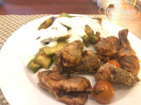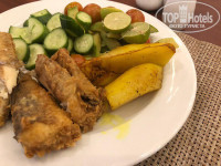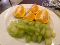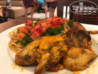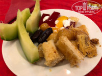 Томатную пасту не добавляют разве что в сладости! Много кабачков и маринованных овощей (весьма своеобразного вкуса). Всегда есть курица и говядина. Салаты в основном с отварным картофелем. Сыр не вкусный и колбаса тоже не съедобная. По утрам всегда есть фета помидоры и омлет. Очень часто все подают в панировке обжаренное во фритюре (периодически масло сильно горчит и пахнет), но всегда есть альтернатива можно взять что нибудь другое... Фруктов почти нет, но всегда есть вкусные финики.