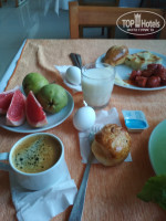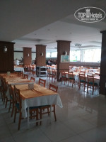 Ресторан один, с летней открытой площадкой с видом на море, вечером на ней ужинать одно удовольствие. Оформление ресторана очень похоже на простую столовую. Питание стандартное среднее, из мяса в основном курица, говядина и рыба бывает редко. Ежедневно на сладком столе была пахлава различного вида. Пиво разливное хорошего качества, вино сухое красное и белое наливают из бутылок тоже очень даже ничего. Бар в отеле находится около бассейна, между корпусами, там пекут очень вкусные лепешки с разными начинками, стоит попробовать. А вот вино в баре лучше не брать, разливная порошковая кислятина. Вместо него брали джин с тоником.