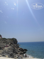 До пляжа 3 минуты, через подземный переход, но сам Пляж очень маленький, с огромной опасной лестницей. Было обрушение скалы, и пляж стал еще меньше, придете во время будет вам лежак, нет - кидайте полотенце. Лежаки также есть выше, не только около воды. Вход в море хороший, дальше большие камни, но их видно и проблем особо не доставляют. Так же есть большой и красивый пирс, он находятся как раз рядом с пляжным баром и кафе где можно полноценно пообедать. И паста и зелень и вкуснейшая пицца. Из напитков также пиво, вино, соки лимонады.