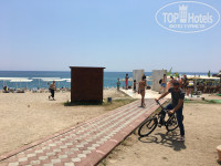 Пляж находится ровно в одном километре от отеля, это 10-15 минут ходьбы. Есть трансфер, но я его избегала, автобус душный, грязный и очень много народа в нем. Пляж маленький, лежаки напиханы вплотную, место в тени надо занимать сильно заранее. А когда заехал лагерь, пляж просто переполнен. По-соседству почти пустой городской пляж с платными лежаками, но оттуда постояльцев отеля гоняют, можно только без лежака и не под тентом. Вход в море плохой, очень крупные камни, без обуви не войдёшь. Нормальный вход с городского пляжа, можно и босиком, но там лучше не купаться. Пляж отеля за 2 недели, пока я его посещала, ни разу не убирался. Приходила около 8 утра - никаких следов уборки, только лежаки сложены в стопки и напиханы вплотную, по пять штук в ряд под тент. Матрасов на лежаках до последнего дня не было, появились только 10 июня.