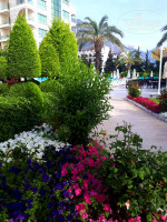 Территория отеля компактная, но очень красивая и уюная, везде зелень, цветы, горы, сосны…