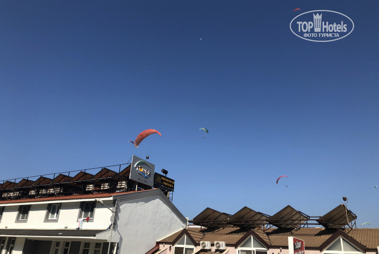 выходите на набережную и смотрите как летают парапланы. Каждый оператор имеет свой маршрут полета и место посадки. Одни залетаю тдальше в море и облетают Голубую лагуны и правые горы, другие уходят левее и садятся вдоль левого склона, третьи уходят сразу левее и садятся на пляж в соседней бухте. Интерестно траетория оператора заходящего на посадку через центральную улицу курорта -над отелями.