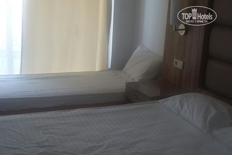 Отдыхали в Турции во второй раз, в Сиде впервые. Начну с заселения. Приехали мы в отель в 9 утра. Из аэропорта ехали сравнительно недолго, 1 час с небольшим. Заселение в номер в 14:00. Отправили сразу на завтрак, после прогулялись по территории и до пляжа. Вернулись в отель в 10:30. Ждать еще очень долго, дети устали(8 и 12 лет). Тут мне одна русская пара подсказала немного доплатить и возможно номер дадут. Так я и сделала. На стойке регистрации как смогла объяснить на ломаном английском(на русском говорят очень плохо), чтобы поскорее заселили, отдала 10$. Через 40 мин бы уже были в номере. На втором этаже нам достался номер стандарт с выходом на территорию отеля и бассейны. Нас он вполне устроил, места троим хватило). Из техники и сантехники все работало исправно. По ТВ нашли 6 русских каналов.
