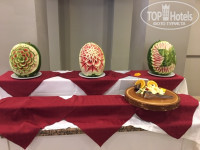Кормление было отличным. Большой выбор овощей тушеных, вареных, пареных. Фруктов всяких разных. Постоянно какие-нибудь супчики, в основном супы-пюре (моя тема). Каши в основном рис, молочные каши. Мясо в основном дичь (кура, индейка) вареная, жареная, пареная, телятина - тоже самое, даже говорят барашка была, но я не видел. Ресторан огромный 2 этажа. Есть зал с кондеем - там мы ели всегда в обед - прохладно. Некоторые отдыхающие постоянно устраивали очереди. Никогда не стоял. Всегда есть альтернатива что съесть.