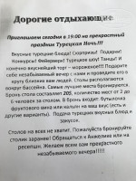 ни когда не писала отзывов, но ы этот раз просто накипело! Приехали в отель рано утром, еще успели на завтрак. первое, что бросилось в глаза, это замусоленные столы и стулья. мухи по всюду и будут вас сопровождать завтрак, обед и ужин. рестораном это сложно назвать, это столовка. еда. мало, однообразно,не вкусно. всегда очередь, особенно за картошкой, которая жарится в черном фритюре(масло не менялось за 10 дней нашего пребывания. мяса как такового нет, всего пару раз были просто куски курицы. Обычно все в каком-то соусе, подливке,очень на любителя. Салаты овощные пару раз были кислые, огурцы всегда заветрянные. Выпечка вся с растительными сливками, кончается быстро, местные сладости не самые лучшие, что есть в Турции. Кроме арбузов и дынь(не сладких) были яблоки и кислые сливы. На завтрак нет ни булочек, оладушек, блинчиков. Питьевая вода в кулерах с запахом хлорки(как из-под крана) , каждый день покупали бутилированную воду. самая дешевая в Мигросе и в магазине на территории отеля. номера на 3. уборка заключалась в смене белья(которого часто на все номера не хватало). Текли душевые( у нас было 2 номера и в обоих была эта проблема) В нашем номере 307 вечером отсутствовала горячая вода. сантехника не чистилась ни разу, не пылесосили(сломался пылесос). Полотенца надо выпрашивать, как и легкие пледы. При следующей уборки они благополучно пропадали. Интернет. он как бы есть и его как бы нет. заплатите 10$ за неделю и он будет работать с трудом через раз, даже на лобби. постоянно вылетает и если вы потеряли пароль и логин, вам не торопятся его возобновлять, только если поругаться. Лагерь. Детей очень много, они шумные, мусорят, ни кто за ними не убирает, в комнатах живут по 6-8 человек.В холлах часто проводят репетиции, громко, шумно, с горами мусора, которые так и может лежать несколько дней. Лестницы вообще ни кто не моет. пляж. идти прилично долго, по жаре. места мало, на всех не хватает. отдыхают сразу два отеля. Пляж напоминает Сочи, яблоку не где упасть. если пришел позже 9, место будет только под солнцем. Ходит шатл. Но он такой пыльный и грязный, в нём настолько душно, что пешком по жаре лучше пройтись. Расписание совершенно не для отдыхающих. Последний рейс уходит в 5 вечера.Ходит с интервалом 2 часа, начаная с 9. Заход в море сначала крупная галька потом мелкая, не очень удобно , но терпимо. На пляже есть платный бар с мороженным, водой, и коктейлями(видимо смузи). На лобби есть бар, но от него только название, он не работает также как бар в ресторане. Детям в баре не дают больше 1 стакана напитка, а стаканы там пластиковые и частенько не доливают, стеклянные стаканы только для ресторана, и часто кончаются, как и напитки. Отель не может физически обслужить такое количество народу(из-за лагеря), поэтому и перебои с напитками, едой, и с бельём.