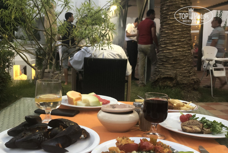 Из мяса я вам особо не подскажу , я его почти не ела ) курицу давали точно ) и ещё какие-то стейки на мангале ) вообщем выбор был всегда ) рыбу тоже видела , почти каждый день ) супов всегда 2 вида была , тунисский , овощной и ещё какой-то ) ну пойдёт)морепродукты: креветки мидии кальмары , но в основном это мидии, они были каждый день ) последние дня 3 давали крабов )