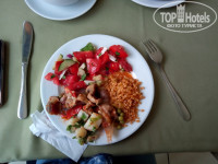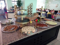 На обед и ужин много различных мясных и овощных гарниров, каждый день жарили рыбу. Большой ассортимент салатов, различных соусов и подливов.Один раз даже шаурму делали. Фруктов в отеле очень много(что очень радовало) :черешня, дыни, арбузы, виноград, персики, сливы, яблоки,абрикосы. Десертов тоже очень много разнообразных
