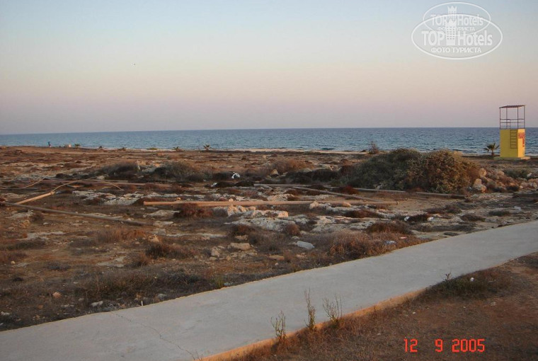 С территорией - тоже небольшая проблема. Отель состоит из двух прямых частей, под углом 135 градусов. Все что внутри этой территории - зеленое, поливается. Но если вы хотите пойти на море, то это метров 300-500, и как только заканчивается бассейн + еще метров 20 - начинается выжженый солнцем глиняный пустырь, на котором выляются какие-то ржавые трубы, бутылки, мусор. То есть то, что мы видели на картинке в агентстве - совсем не то, что на самом деле.