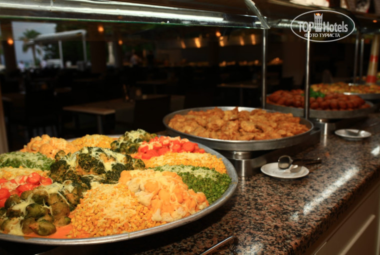 Еда вкусная,для двух девушек много не надо,по этому многое мы не попробовали.(из того что вспомню,но перечислять всё долго,была рыба,мясо,печень,турецкие сладости,даже пекли торты,(сладости скажу на любителя),много овощей,фрукты,напитки заказываете сами у барной стойки),хлеб,по утрам при нас жарили блинчики и оладьи, много хлопьев,различные джемы и шоколад,вкусный чай,за кофе такое не могу сказать(лично мне кофе не понравился). С 11 до 16 рядом с пляжем работает снек-бар,сами можете себе сделать гамбургер какой вы захотите ,картошка фри,так же работает там бар с 11 до 22 часов.