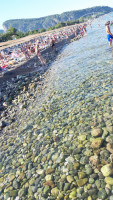 Пляж находится очень близко к отелю ( думали, что намного дальше),сразу же приобрели специальную обувь для пляжа и захода в море- и не пожалели, огромные камни доставляли неудобства, магазинчиков рядом очень много .Море очень теплое