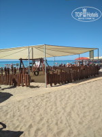 Море чистое, теплое. Пляж тоже чистый, песочный, около воды полоса гальки идет и еще метр-два в воде тоже галька, потом песок. На пляже есть детская площадка – она под тентом, что очень удобно. Всегда находили свободные лежаки. Конечно были лежаки, где лежали полотенца и никого не было, но свободные места всегда были (хотя мы на море приходили рано часов в 8-9).