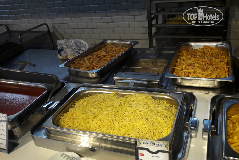 Кто говорил про очередь в ресторан и невозможность найти столик? На втором этаже более 50% столиков свободны всегда. Еды хватает, достаточно разнообразно. Кто утверждал, что одно и тоже ? Около 4-5 видов макарон в разных соусах или без. Около 7 видов тушеного мяса с овощами. 3-4 вида каш на завтрак. 5-7 видов джема.