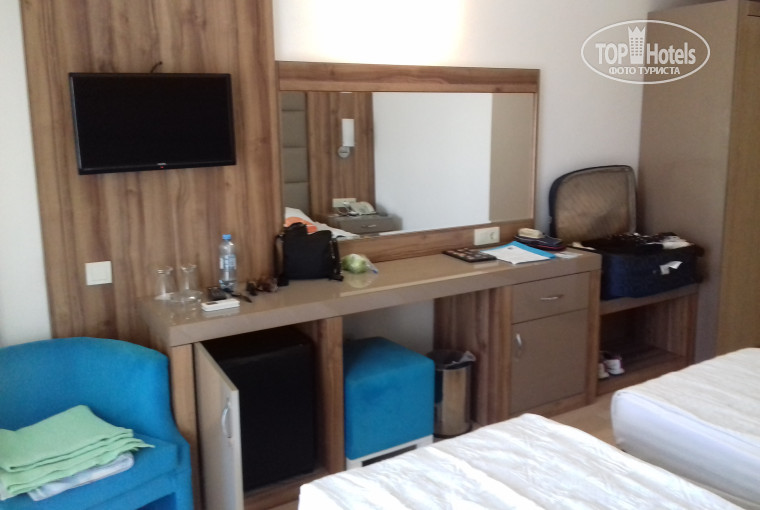 Номер у нас был 411, с видом на бассейн и танц.площадку. Оч.тихо, спокойно. По вечерам музыка часов до 11, так что нас ничего не беспокоило. Обычный стандартный номер: две кровати, тумбочки, стол с зеркалом, шкафы, холодильник, сплит. Все работало, ничего не отваливалось))) Постельное белье чистое, полотенца чистые. Пляжные полотенца выдают по карточкам в СПА, обмен платный. Я беру с собой всегда свои полотенца, поэтому отельными практически не пользовались. В холодильнике вода только при заселении, потом пожалуйста в любом количестве в столовой, в любом баре.
