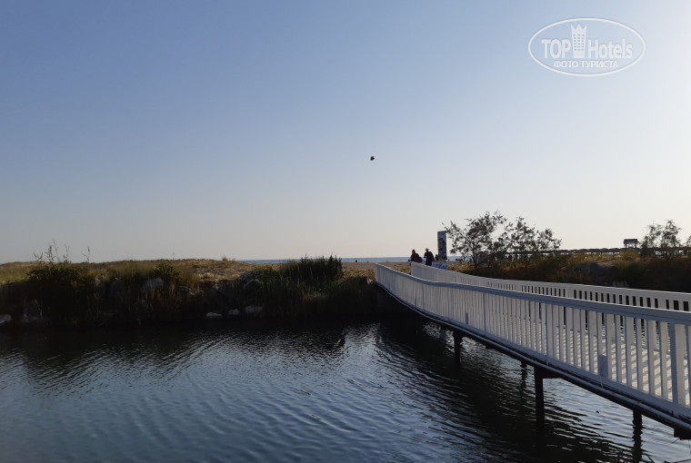 2. Местоположение и территория. Отель для тех, кто хочет отдохнуть на природе, вдали от цивилизации. Расположен в заповедном лесу, вокруг - сосновый лес, горы, речка (или даже система рек и водоемов, как удалось рассмотреть с песчаной дюны на соседнем пляже). Соотвественно, воздух. Сухой, горячий, с ароматом хвои. Несмотря на речку вдоль территории, не влажно и не сыро (чего я боялась). Комары (которые фигурируют в ряде отзывов как единственный минус этого места) в августе почти не докучали, немногих особей (кстати, довольно мелких по сравнению с подмосковными) отпугивал фумитокс. Спали с открытыми дверями - никакого противного писка под ухом. Короче, в августе- сентябре это не проблема. По лесу можно гулять, он растет прямо на песке, довольно живописный. Территория огромная, с большими деревьями, в тени которых - домики-бунгало на 2-3 номера. Мы жили на первом этаже. Гости рассредоточены по территории, никого не видно-не слышно, полное ощущение "жизни на даче" - только с круглосуточным сервисом. Даже детей, коих там в огромном количестве, слышно только тогда, когда они шествуют в ресторан. Звукоизоляция хорошая. Наш номер был напротив детского бассейна с аттракционами и водяными горками - его присутствие вообще не ощущалось, равно как и наличие соседей за стенкой и на втором этаже. Если нужно еще тише, лучше брать номер в конце территории, там вообще очень камерно и уединенно.