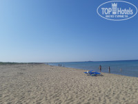 Пляж. Огромный, пустынный, песочный, с дюнами, растущими прямо на песке цветами. Лежаки и зонтики бесплатные, но в зоне зонтиков было шумновато, поэтому мы оттаскивали лежаки метров за 30 (что разрешалось - вечером сотрудники стаскивали их обратно), и получали полную иллюзию уединенного отдыха. Метрах в 100 еще небольшой пляжик от соседнего кемпинга, а дальше - несколько километров "дикой природы". Вход в море пологий, дно песчаное. Купайся где хочешь, никакой "зоны ограждения" 10 м на 10 м, вне которой ездят моторки, скутера и надувные бананы. Плыви куда хочешь. Волн нет, прозрачная, чистейшая вода. Вначале показалась немного прохладной - Ионическое море глубокое, прогревается дольше, но в сентябре была как парное молоко. По дороге на пляж - речушка, в которой водятся прикормленные туристами рыбки. Очень живописный пейзаж.