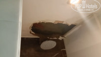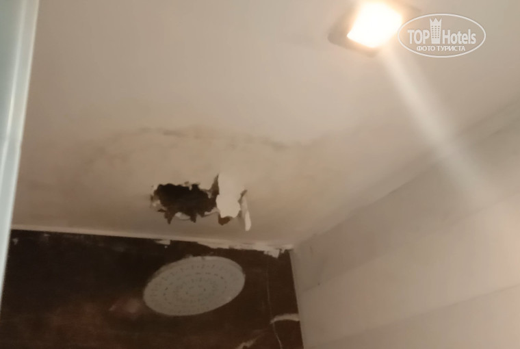 Неисправность была устранена персоналом отеля очень странным способом – в потолке была проделана дыра, через которую могла стекать вода, что не устранило ни саму проблему, ни угрозу поражения электрическим током. При этом в номере стоял жуткий запах канализации. Не дождавшись предложения о переселении в другой номер с нормальными условиями проживания и без угрозы для нашей жизни мы обратились с данной проблемой в главный корпус отеля, где нас заверили, что в 09.30 следующего дня нас переселят в другой номер. Результаты «ремонта» зафиксировали на видео.