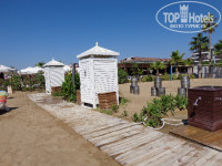 Пляж расположен в 2-х минутах ходьбы от прохода через пешеходный променад, разделяющий пляжи от отелей первой линии. На пляже этого отеля очень тихо и спокойно. Песок чистый и постоянно убирался лишний мусор. Лежаки расположены достаточно свободно по сравнению с пляжами соседних отелей. По пляжу вдоль моря можно пройти до речек, с мостиков покормить рыбок и посмотреть на черепах.