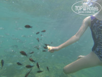 Отдельно про пирсы. Длинный пирс с рыбалкой - только 16+. Нашей дочери 14, пришлось обманывать охрану, потому что она и папа плавали с большого пирса и снимали рыб. Их там огромное множество, и они красивые. Камни на дне похожи на кораллы, с дырками. С большого пирса сильно лучше сделан спуск в море – очень капитальные и плавные ступеньки, глубоко уходящие в море. Даже если у вас есть проблемы с ногами, то на большом пирсе вы не испытаете проблем ни при спуске в воду, ни при подъеме. На маленьком пирсе ступеньки гораздо хуже, но тоже неплохие. Все относительно, оказывается. )