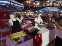 Питание - очень бестолковая организация: постоянные очереди, нехватка приборов, и мест просто хотя бы для принятия пищи. Мяса не было ни разу (только курица и индейка), да пару раз костлявая рыба. Более-менее - в турецкую ночь по понедельникам... А так обычная еда с поправкой на типичную турецкую 4*. Еда адаптирована для россиян. Никакого детского стола, как заявляют, нет. Есть пара старых хамоватых официантов, которые могут послать... за вилкой на первой этаж, ибо у него тут закончились. Либо налить в пластиковый стаканчик....