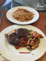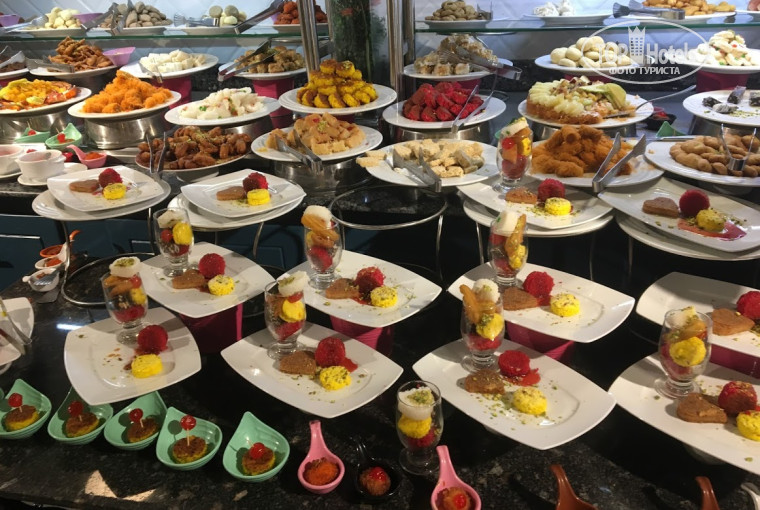 Поварам - уважение и благодарность. Блюда не только вкусные и качественные, но и подача как настоящем ресторане. Мясо - говядина и курица, во всевозможных вариантах: гриль, тушеное, на сковородках с овощами, печёное. Кальмары, рыба, креветки. Выбор салатов, овощей, включая овощи гриль. Йогурты, сыры, ветчина, пицца, даже печеная картошка в мундире, овсяная каша и запеканка. Кондитерские штучки - восторг. Пирожные, булочки, пирожки, пахлава- все вкусно и настолько красиво оформлено, как с маленькой частной кондитерской.