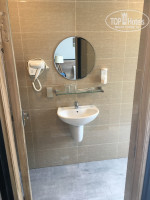 Ванная весьма удобна, и даже просторна, в какой-то мере. По центру раковина, справа от входа душевая часть, слева туалетная. На полочке, над раковиной солидный набор принадлежностей, фен и розетка рядом, а на стенах висели емкости с мылом, гелем для душа и шампунем.