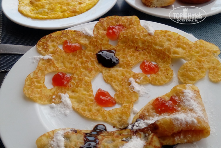Ресторан большой мест всем хватает, но был один вечер, когда люди ходили с тарелками в поисках места, столик освободился и уборщики не просто убрали грязную посуду, а даже перестелили скатерти, утром и днём столики протирали, а не просто с салфеток стряхивали крошки, посуда была всегда чистая, правда со сколами, но всегда можно было выбрать нормальную тарелку, чашек для чая и кофе тоже всем хватало, вот только ложки нужно было искать, непонятно почему ими не сервировали стол, но это тоже не проблема мы всегда носили свою с собой, их были не чайные, а десертные и ребёнку в рот не помещалась. Для детей отдельная комната с маленькими стульчиками и столами, телик с мультиками, но все ходили со своими телефонами или ноутами, где были записаны свои подборки мультиков. Завтракать мы приходили почти самые последние и еда была всё та же, что и на открытии ресторана, неудобство причиняли вороны, они сидели в ожидании момента, когда ты отвернёшься или отойдёшь за чем нибудь и хватали еду из тарелок. Для детей были йогурты в стаканчиках, без вкуса и с клубникой, если нужного не было, всегда можно было попросить и его приносили. Персонал очень улыбчивый и доброжелательный, очень любят деток, всегда помогали успокоить каприз, моя дочка сначала их боялась, а потом даже научилась давать пять, вернее они её научили и всегда улыбалась при виде их. Вечером при открытиии ресторана, мясо давали " по два кусочка в руки, но если попросить, то положат больше, как я поняла, чтобы не создавать очереди, а ч/з час уже никто не стоял и можно было самому брать, да и наши люди не умеют себя контролировать набирают горы еды, не съедают и потом это всё выбрасывается и скулят, что еды мало или по выдочке. Фруктов хватало, жаль что дыня была зелёная и не вкусная и при этом её всё равно нагребали тарелками. Вот что мне не понравилось в ресторане это еда, вернее качество её приготовления, овощи не доваривали, недотушивали, они были практически сырыми и хрустали на зубах, а мясо и птицу высушивали в хрустящие угли, не понятно это для них нормально или они просто не умеют готовить?!? Очень бы хотелось, чтобы это предложение донесли до шеф повара. На ужин мы брали вино - белое кислятина, только под тортик, а красное довольно сносное, из алкоголя пили пиво несколько раз пробовали джин, остальное гадость, из дома привезли свой виски, мы не особые питки поэтому бутылки нам хватило на все 10 дней. Днём можно было перекусить на основном бассейне готовили пиццу и как обычно два кусочка в руки, но если попросить давали ещё, а если поулыбаться ( девочкам на заметку) то можно просить сколько хочешь, мне давали по 6 кусков с разными вкусами. А в столовой на завтраке повар за одну улыбку омлет жарил на сливочном масле, а из блинов цветы и всё украшал джемом, шоколадом и сахарной пудрой. Так же был перекус на пляже (пицца, картошка фри, сосиски, овощи и фрукты) А перед ужином был перекус на терассе, но мы об этом поздно узнали, да и еды с собой было привезено не мало, мы брали свою колбасу, детскую кашу, консервы, печеньки, фруктовые пюрешки, соки, хоть у нас ребенок и всеядный, но ей не очень по вкусу была их кухня, сухой рис и курица ей не нравились, так что если едите с ребенком продумайте, что можно взять с собой.