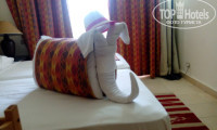 Прилетели мы вечером, наш отель был первым - повезло, сели в автобус и ждем мин 20, почему не едем. хоть и работает кондиционер, но всё равно жарко, мы ведь в тёплой одежде, есть такие пассажиры, которые хотят подключить интернет сразу в аэропорту или походить по магазинам, ОГРОМНЕЙШАЯ просьба к таким, вы задерживаете ни только себя но и целый автобус людей, которые устали после перелёта, дети нервничают и не очень приятно сидеть в этой жаре под их плач. Приехали в отель, заполнили карточки, сразу одели браслеты и отправили на ужин, хоть он уже и заканчивался пустых блюд мы не наблюдали. С мужем решили, сначала посмотрим номер который предложат, а потом уже будем менять за деньги, единственное попросили на первом этаже, т.к с коляской на второй этаж ползать не удобно. Как я поняла, в этом отеле не принято проводить гостей до номера и самому нужно блуждать в поисках, но и тут нам повезло, нас проводили, я уже приготовила1$, муж пошёл осматривать номер, в душевой кабинке бегало пару маленьких таракана, он придавил их и смыл , потом их видно не было ( как мы поняли, номером не пользовались какое-то время и эти гады выползли из какнализации) я проверила фен, свет и наличие горячей воды, но её почему-то не было, парень проводивший нас, сказал, что нужно подождать 1минуту, но её не было и ч/з 5 мин, а муж заметил, что не закрывается балконая дверь, парень затушевался, говорит звоните на ресепшн и всё исправят, пока мы осматривали номер и решали оставаться или нет, парнишка испарился и даже доллара своего не дождался, кстати мы это делали не долго 2-3 минуты. Вода горячая появилась минут ч/з 10 и проблем больше с ней не было, хотя некоторые говорили, что на втором этаже был маленький напор холодной. Ремонтник тоже очень быстро пришёл и балкон закрывался. Мебель стандартная, как и во всех отелях, телевизор не большой, но это вообще не проблема, но вот наша флешка не работала, это минус для нашего ребенка. Вот чайника в номере не было, мы брали с собой кипятильник, но он нам не пригодился, на каждом баре и в столовой на террасе стояли бойлеры с постоянным подогревом, хотя потом я узнала, что можно было попросить чайник в номер. Номер нам достался не плохой с большим балконом и косвенным видом на основной бассейн, очень плохо, что не было выхода ч/з него, было бы очень удобно. Шум от вечерних шоу нам не мешал, если закрыть балкон, то вообще ничего слышно не было, больше шумел кондиционеры, он гремел как трактор, но даже это не мешало ни нам ни ребенку. Рядом в корпусах делали ремонт иногда слышен был запах краски. По нашей просьбе принесли детскую кроватку, за что большое спасибо. Убирали у нас почти каждый день, а если отказывались от уборки, то просто выносили мусор и меняли полотенца,-наши были чистыми, но влажными, т.к не успевали высыхать, один раз сделали слона из подушек и полотенец. Про качество уборки можно сказать на троечку, мне хотелось самостоятельно помыть пол, хотя мы видели, что в соседних номерах мылись полы. Может это я уже придираюсь).