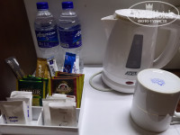 В номере есть чайник, холодильник, фен. Сейф бесплатный. Каждый день пополняют запас мыльных принадлежностей и кофе, чай, сахар. Тапочек и халатов нет.