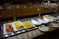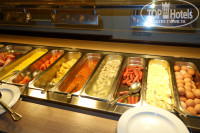 - овсяная молочная каша, сосиски двух видов, перемешанный омлет, глазунья, яйца вкрутую, помидоры на гриле, кукуруза, фасоль в томате, жареный картофель в ломтиках, жареный бекон