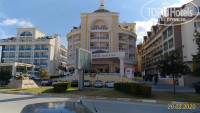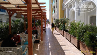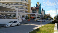 Территория отеля очень небольшая. Корпус «зажат» между соседними отелями – до них с одной стороны около 7 метров, с другой стороны около 15 метров. Сзади отеля расположены бассейны, аквагорки, бар (зимой не работает), амфитеатр. В задней части имеется выход в сторону моря, открывается по графику. До моря от этого выхода около 700 метров. Вдоль моря имеется шикарный променад из дорожек, мощеных плиткой и булыжником. В этом районе Сиде достаточно работающих зимой отелей, поэтому и работает множество рыночков и магазинчиков. На каждом углу предлагают в аренду всякие аккумуляторные средства передвижения (самокаты, кары). За трехместный кар просят 10$ за час.