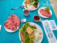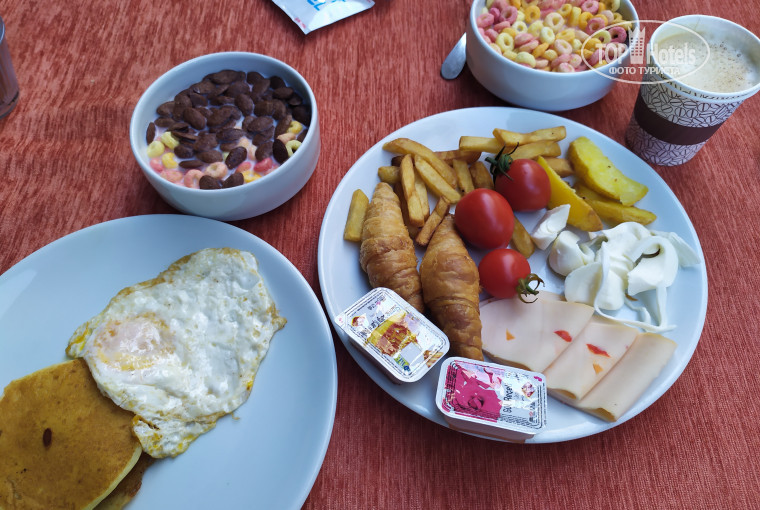 В 9 утра приехали в отель. Попросили подождать номер. Пока сходили на завтрак и прогулялись по территории, в 10 уже заселили. Начиная с ресепшн почувствовали себя как дома. Всегда подсказывали и помогали. Изменяли температуру при входе и перед каждым приёмом пищи. Еды всегда было много, очередь небольшая. Убирали номер качественно, каждый день. Вид из номера был на море справа, слева на бассейн. У бассейна всегда было много людей, поэтому ходили на море, там места хватало всем, не смотря на расстояние между лежаками. Напитков предостаточно, в ресторане, в баре у бассейна, и в кофе-хаусе. Если не успели на обед, работает снек-бар до 16:00. С 15 до 15:30 подают вкуснейшее мороженое. С 16 часов - сладости. Через день была анимация. Танцы, живая музыка. Прямо у отеля автобусная остановка, автобус номер 1 идёт в центр по главной улице. Официанты приветливые, повара вкусно готовят и на ужин работает отдельная стойка, где при вас готовят и подают курицу/рыбу и пиццу. Столовые приборы в индивидуальных упаковках, накладываем еду в одноразовых перчатках. Девушки с ресепшн, менеджер и хозяин отеля всегда интересуются гостями, решают любые проблемы.