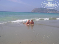 До пляжа идти метров 20 по переходу,пляж песчаный,вход в море плохой,сплошные камни,купаться лучше возле пирса,там песок.Зонтики,шезлонги,матрасы-бесплатно,полотенца-под залог.На пляже работает бар от отеля.Тоже бесплатный.