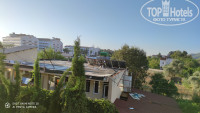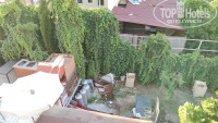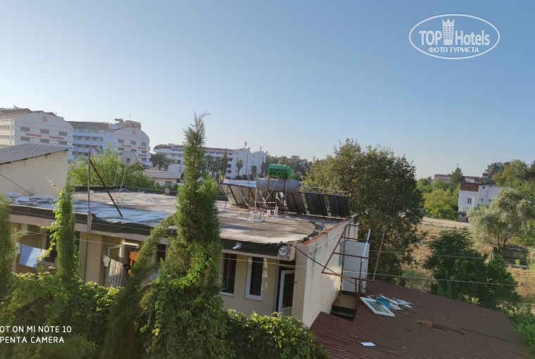 С другой стороны сдаются номера отдыхающим.видно кучу старых унитазов на крыше и прочий строительный мусор( Не наш отель). Газон (примерно 10 м.кв.) с проплешинами, засеяли бы...