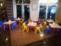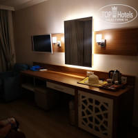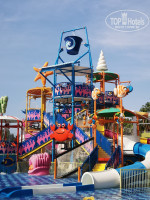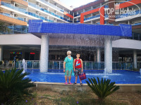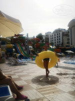 мега большой,есть поле для игры в волейбол.Никаких проблем не было с лежаками свободными.АКВАПАРК вызвал восторг у сына,он новый,современный-есть как для взрослых,так и для детей,но стыки в трубах цепляют шорты.Рядом находится дом мороженого,где накладывали мороженое разных сортов и цвета в рожки,а на свежем воздухе 2 женщины пекли лепешки Гезлеме с разными начинками-нам понравилось больше всего с капустой,были с сыром и творогом,с мясом. В ресторане всегда были на раздаче айран и вода в бутылках.Мини-зоопарк находится на пригорке около аквапарка-там гуси,утки,перепелки,голуби,индюки,овчарка,павлин,цесарки и кролики-детям нравится.Посередине мандариновых аллей стоит большая голубятня,как идти к пляжу,и домики для котов у корпусов 4 ки рядом с аквапарком.Большой детский клуб при нас несколько дней работал,площадка с качелями и каруселями для малышей,игровой платный центр недалеко от пляжа.Тренажеры для фитнеса на свежем воздухе в 2 местах,фитнес центр,на территории и в главном корпусе есть разнообразные магазины, фотограф и парикмахерская,столы для настольного тенниса,волейбольная площадка.Интернет не на всей территории ловит-нормально в номере,особенно вечером,у ресепшн,в основном ресторане,на пляже его нет совсем.Сначала дают 1 гигабайт,потом вводите номер комнаты,фамилию с именем и дату рождения и подключаете до конца тура-иногда приходилось перезапускать.Вечернее шоу.Сначала вечернее шоу проходило в амфитеатре недалеко от пляжного бара,потом перенесли на террасу главного корпуса.Анимация и развлечения-вечерняя хорошая-играли на рояле,скрипке,живым голосом пели,детская дискотека была,взрослая.Но днем я видела аниматоров 2 раза-утром у главного корпуса на бассейне-они делали зарядку и музыкой зазывали на активности,в обед была аэробика в амфитеатре.Нам анимация особо не нужна была,но одни из гостей жаловались,что ее практически нет.ПЛЯЖ.Узкая,длинная полоса пляжа,лежаки без матрасов и не у всех есть зонтики.Проблем с лежаками не было,но это конец сезона.Такому отелю,конечно,надо оборудовать пляж современными лежаками и навесом или современными зонтами у каждого лежака.Около бассейнов и в аквапарке лежаки классные,новые.В высокий сезон надо увеличить количество лежаков на пляже. Море просто волшебное,чистое,прозрачное,вход пологий,песчаный,долго идешь и не глубоко-лучший вариант для семей с детьми.На пляже есть разные водные развлечения,в том числе модный сейчас флайборд.С погодой нам повезло-все дни было 29-33,вода примерно 26-27.Рыбки про которых писали в предыдущих отзывах не больно кусали,а как бы трогали, когда стоишь.Только в день отъезда с утра был дождь,но после обеда все уже купались.У входа/выхода с пляжа есть душ,чтобы смыть соленую воду и маленькие лейки для ног.Шезлонги расположены не только на пляже,но и на траве под тенью деревьев.Рядом с отелем несколько банкоматов,огромный базар и аптека,где мы провели хороший шопинг-турецкий текстиль,джинсовая и спортивная одежда,обувь и сувениры со сладостями,чаями.Недалеко от заправки есть остановка,где останавливаются автобусы до Алании,напротив большой платный аквапарк,пешком ходили в среду в Авсаллар на фруктово-овощной рынок,там были также вещи и обувь,недалеко магазин Бим и Мигрос.В сторону Алании недалеко от нашего отеля есть небольшая бухта,где стоят пи