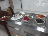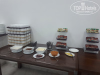 Завтраки очень вкусные!! Рисовая и овсяная каши, колбаса, сыр(не очень), масло, салатики легкие, запеканки, омлет, сосиски, яйца, фасоль, шарики шоколадные и подушечки, молоко, чаи, кофе, блинчики, йогурты, сгущенка, вареники очень вкусные с творогом, огурцы, помидоры, арбузы, дыни, яблоки, инжир, слива, рулетики баклажанные с помидором и майонезом, компот каркаде и сухофрукты, драники, картошка, сметана, печенье, макароны. В день прилета пришлось поужинать: люля безвкусные, котлеты, макароны, салаты с майонезом и еще что-то. Обеды и ужины платные!!!(фото прилагается)