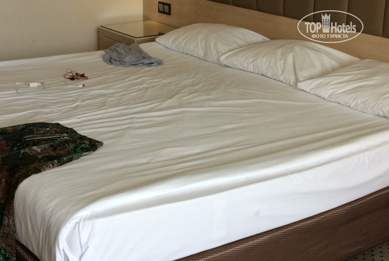 Чистый. Постельное белье белоснежное. Матрац удобный. Кровать - сказка (кинг-сайз). ТВ - рабочий, несколько каналов на русском языке (ТНТ, Россия, 1 канал). Остальные на турецком, английском, польском, немецком. На балконе пластиковый столик, 2 стула, сушилка. Напротив отель Нирвана (было немного шумно от него) при закрытых дверях его все-равно слышно. Соседа (отдыхал один молодой человек) слышно не было вообще, пересекались только на балконе вечерком ))) с другой стороны было помещение для персонала в виде склада для принадлежностей номеров (постельное белье, полотенца и др) поэтому мой сон изредка нарушался только смехом из соседнего отеля и соседями, которые выходили из лифта и направлялись в свои номера (мой номер 1429 расположен напротив лифтов). Но лифты не доставляли какого-либо беспокойства. Мыльные принадлежности имеются, при необходимости докладывали. С собой я ничего не везла, пользовалась отельными, вполне хватило как по качеству так и по количеству. Полотенца имелись на 2 человека, чистые, менялись каждый день. Уборка на этаже проводилась в первой половине дня, где-то между 10-12 часов. Для тех, кто любитель поспать наверное будет немного неудобно))) В мини-баре имеется 2 банки пива, 2 воды без газа, 2 минералки, 2 колы (классик и лайт), спрайт, фанта, по пачке соломки с пиву и соленного арахиса. Пополнялся по необходимости. На сайте некоторые фото номеров устаревшие, видимо до ренновации. От туристов прошлого и текущего года фото в комментариях соответствуют действительности. Немного омрачило впечатление от номера наличие мелких муравьев в области прикроватных тумбочек. Может я и не увидела бы их, если бы не сдвинула 1 тумбочку ближе к кровати для телефона)) Вода в душе чередовалась холодная-кипяток))) Wi-fi на территории всего отеля скорость отличная. Я свободна смотрела фильмы, соцсети работали без проблем.