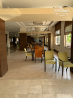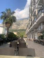 Территория отеля маленькая - это сам отель, с террасой со столиками, бассейн с одной горкой (которая работает по определенным часам) и лежаками вокруг и сцена с баром. Отель находится на второй линии от моря. Все минусы и недочеты перечеркивает вид на горы. Это невероятно могущественно и красиво.