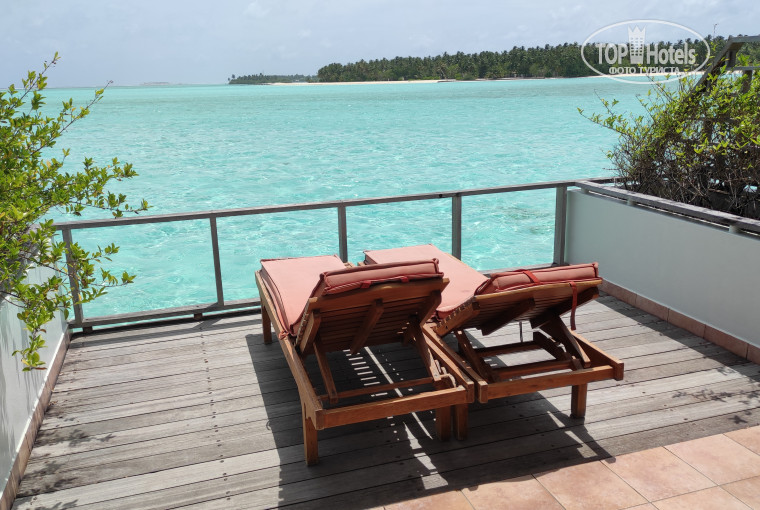 Первый день пожили, кстати, в водном бунгало - ну что тут сказать, есть и плюсы, и минусы. Плюсы - большее ощущение уединенности. Отсутствие кораллов, опять же. Номер вроде чуть больше и чуть симпатичнее (и кофе-машина есть). Но минусов тоже хватает - своя зона, где можно полежать на лежаках, очень небольшая и строго ориентирована, т.е. у вас либо с 12 до заката палящее солнце, либо наоборот - с утра и до обеда, и без вариантов в виде "оттащу лежак под пальму". Чесать по деревянному настилу до берега под жгучим солнцем тоже так себе удовольствие - тут велосипеды обязательны, наверное. Спуск в воду по личной лестнице: последние ступени очень скользкие (наросло что-то вроде ила). Лагуна по пояс, волны большие. Зато песок под ногами.