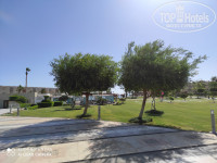 Отель имеет большую, красивую, зеленую территорию с собственной бухтой- пляжем. Работы по озеленению и поддержанию состояния отеля проводятся постоянно, ежедневно поливаются газоны. Под пальмами, деревьями, кустарниками организовано капельное орошение, постоянно проводится обрезка деревьев. Благодаря большому пространству территории и удалению зданий температура вечером довольно комфортна(на начало июня), ночью мы открывали выход на террасу и выключали кондиционер. На территории расположены 6 ресторанов, 3 бара, футбольное поле(не функционировало), волейбольная площадка, площадка для игры бочче, каскад бассейнов, джакузи, амфитеатром, 2 релакс пляжа от 16 лет, спортивный бар оборудованный бильярдом, спортзал.