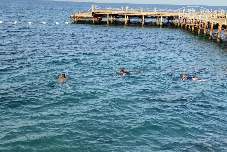 +купаться можно также с понтона, оборудованного лестницей для спуска в воду. Там же можно взять жилет для плавания (бесплатно), маски с собой. Безусловно, море очень красивое, вода теплая). По периметру зоны для купания есть сети, чтобы крупные рыбы не заплывали. Кстати нам удалось наблюдать, помимо мелких красивых рыбок - крылатку, рыбу-камень, морских ежей, друзья видели кальмара и небольшого ската. В общем, как повезет) На море довольно ветрено по утрам, пройдя по понтону велика вероятность потерять головной убор, или полотенце, например)