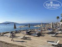 14. Песчаный кусочек пляжа с прямым заходом в море маленький. Остальной пляж- плиточный настил с лежаками вплотную.