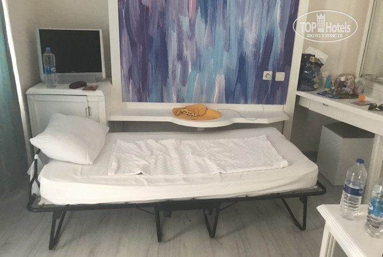 Дорогие туристы, этот отель настолько разочаровал нас, что хотелось бы поделиться своими впечатлениями. Во-первых, отель очень старый, там подмазано, сям подделано. Ужасно прокуренные комнаты, да и сам ресепшн. Будьте готовы к тому, что вам на всех выдадут один ключ от номера. Дополнительный ключ вам встанет в $30 (хотя для турков только $10). Семейный номер современным далеко не назвать. Стоит двухспальная кровать, что-то под типа дивана и самая настоящая раскладушка. Уборку номера делают через одно место, да там и убирать нечего, кровати они не заправляют, ибо нечем: вместо одеял - тупо большие вафельные полотенца. В номере нет ни кондиционера для волос, дверь закрывается, если по ней ногой долбануть ( отрывается также) слышимость ночью просто замечательная: сосед чихнул, можно пожелать ему быть здоровым. Кондиционер только в комнате с кроватью, поэтому даже приходилось спать на балконе, потому что другая комната с диваном и раскладушкой нагреваются, что спать невозможно.
