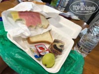 Когда выезжали рано в аэропорт сообщили на ресепшене, чтобы нам приготовили завтрак с собой. Выдали бутылку воды, кусочек кекса, масло, джем, маленькую грушу и 2 куска хлеба между ними по кусочку колбасы и сыра. Приборов не было.