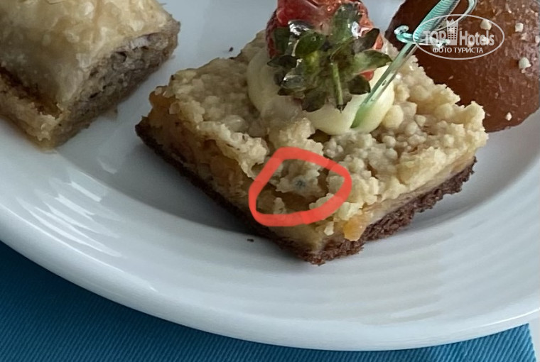 отдыхала 12 ночей. в Турции 5 раз. самый плохой отель в котором была. 1) территории нет, зелени нет совсем. 2) ночью спать с кондиционером холодно, а из окон пару раз пахло гарью. 3) из алкоголя по итогу ничего не пила вообще, невкусное абсолютно все. пила воду и чай. как это пьют немцы, мне вообще непонятно. при отеле есть «витамин» бары, где делают красивые коктейли за деньги 4) про еду. в целом нормально, были нектарины и персики. рыбы очень мало, никакой дорады нет, пару раз было какое-то подобие. в остальные дни - жареная селёдка. вафли старые, сухие, ела один раз. мороженого в тот день к ним не давали. советую проверять столовые приборы. стаканы моют хорошо, ложки\вилки - плохо. в середине отпуска отравилась. в последний день на десерте нашла плесень (на фото выделила). 5) анимация вся для немцев. отель в целом немецкий, пару раз проводили бинго на анимации, покупаешь билет за 3 евро, а потом выигрываешь невкусный безалкогольный коктель или чудо-маску с сомнительном спа. тот кто не покупает, просто сидит и смотрит, как остальные забирают свои призы. танцевать после анимации не выходит никто, ни немцы, ни русские. музыка отвратительная играет ровно до 22:30. неплохие танцевальные шоу. самое грустное, что в соседних отелях играет нормальная музыка до 24, а ты из этой «коробки» можешь только смотреть. 6) на пляже почти все лежаки закрыты от солнца, дистанции между ними нет. открыта и относительно изолирована только первая линия (которую занимают с 7 утра). часть лежаков привязана. один раз пытались вытащить, в итоге работник отобрал и унёс обратно. можно лежать на песке на полотенце, без лежака. 7) гулять вечером негде. променад возле моря красивый, но всю красоту видно только днём.
