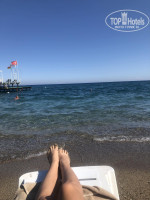 Дорога до пляжу займає приблизно 8 хв. Море дуууже класне, чисте і прозоре. Вхід пологий і зручний. На пляжі дрібна галька, спеціальне взуття нам не знадобилось. Територія пляжу досить мала, лежаки розміщення близько один до одного, матраців немає. Наш пляж був разом з пляжем від сусіднього готелю, тому можна було розміститись, де кому більше сподобалось. Бар на пляжі працює з 10.00 - 16.00. З алкогольних напоїв - тільки пиво. З 12 год можна було поїсти бургери, інколи були ще картопляні нагетси і овочі.