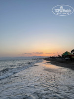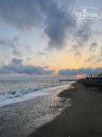 Пляж большой, лежаков много, всегда находили свободный (единственное, чтобы быть поближе к морю занимали где-то с 8.00 утра), если чуть дальше от моря, то можно найти и позже. Пляж песчаный. Море теплое, бирюзовое, чистое, утром спокойное, а после обеда начинаются большие волны (очень классно поплавать и попрыгать на волнах). С правой стороны виднеются горы. Закаты на фоне моря и гор просто потрясающий.