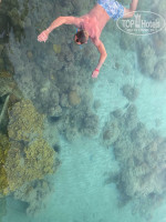 Добрый день, коралловый риф небольшой, но есть. Если встать на пирсе, примерно напротив 3 лестницы, слева можно увидеть коралловый риф ( большое темное пятно), плыть минут 10