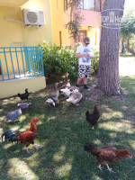 На территории есть птичник , утром и днём на всей территории гуляют птицы ( цесарки, петухи, куры, индюк, гуси, утки). Приходите с хлебом, кормите. Видно, их кормят не очень хорошо. Для детей общение с птицами в радость, да и взрослым тоже. По утрам на террасу за окном вбегает стайка цесарок и начинает дружно курлыкать! Красота! На территории стоят качели-скамейки, во дворах гамаки. Гуляют кошки. Кормите и кошек! Два раза видели ёжика.