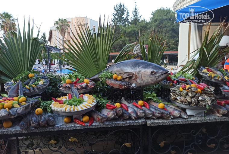Кормили очень вкусно и довольно разнообразно. Мясо, рыба, салаты, фрукты-овощи, напитки в ассортименте. За десять дней отдыха я не почувствовал что еда приелась. Завтрак показался немного однообразным, с интересной особенностью: начало завтрака в 7.00, а яичницу ( которая сборная с луком, овощами) почему то начинали жарить в 8.00. По средам я так понял у них тематические ужины. В первую среду был рыбный ( тунец, раки, рыба в различных вариациях, ролы), во вторую среду было большое разнообразие сладостей. Так что приходите на ужин без опозданий чтоб не стоять в очереди. В обычные дни очередей не было ни на завтраке, ни на обеде и ужине (мы приходили всегда к началу). Максимум два-три человека собирались. С местами тоже не было затруднений. Официанты работали с переменным успехом, наверное зависело от смены. Иногда моментально забирали тарелки, иногда заканчиваешь обедать с полным столом пустых тарелок. Из фруктов были каждый день апельсины, яблоки, грейпфрут, арбузы. Один раз была вишня.