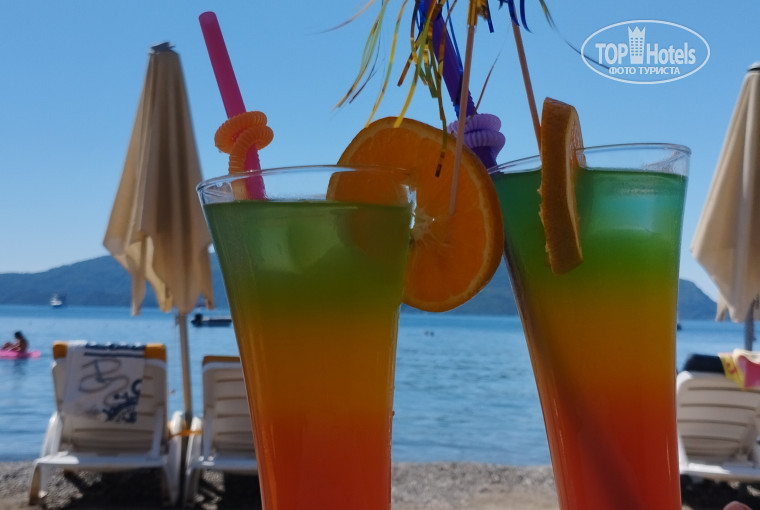 Море прохладное, бодрящее. До него идти пару минут. Лежаки брали у ресторана maymi за напитки(соки, детские коктейли(≈ 28-30 лир), айран, кофе и т.п). На пляже песок с мелкими камнями, в море камни по-крупнее. Ходить без обуви комфортно.Можно попросить полотенце, пепельницу, столик у официантов